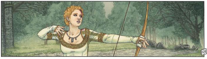 La dernière case de la page 123 est conçue comme une image panoramique. «Cette case est centrée sur l'héroïne Oriane, commente Béatrice Tillier. J'ai voulu suspendre l'action, ainsi que le temps. On comprend que le geste de l'héroïne est figé. La flèche est décochée. L'arc bascule tout seul vers l'avant dans un mouvement de balancier. Seule la corde de l'arc vibre encore. Le visage d'Oriane est triste. Pour l'anecdote, au départ ce devait être un personnage secondaire. Elle devait même mourir à la fin du tome 1. Mais quand Jean Dufaux a vu son petit visage charmant, et son air mutin, il a été ensorcelé par elle ! (Rires) Il a modifié son histoire pour en faire une héroïne principale... Dans cet album, elle porte les cheveux courts. C'est un sacrifice à sa féminité. Un symbole soit de rébellion, soit une façon de grandir. Oriane devient ici une sorte de guerrière, un peu garçonne. Son visage évoque les représentations que l'on a de Jeanne d'Arc.»