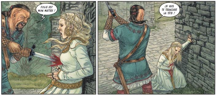 La planche 123 de l'album figure parmi les plus impressionnantes de l'album. «C'est une planche assez violente, admet Béatrice Tillier. Dans le premier strip, Odric l'assassin tue un personnage principal, la mère d'Oriane, la Dame Ceylan, mère d'Oriane. J'avoue que c'est toujours triste, même pour un dessinateur, de voir disparaître une héroïne que l'on a dessinée sur de nombreuses pages. J'ai imaginé l'action en utilisant une vue de profil. Il faut guider l'œil du lecteur. Cette vue de profil permet de visualiser l'arme qui s'enfonce dans le ventre de Dame Ceylan. L'homme est possédé. La deuxième case est plus haute. Le regard du lecteur s'élève. On devine que l'assassin lève son épée pour mettre à exécution son funeste plan : trancher la tête de l'héroïne... Ici, tout est question de point de vue. C'est l'assassin qui occupe l'espace.»