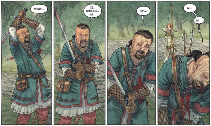 Dans le deuxième strip, Odric est le centre d'attention numéro un des lecteurs. «Ce deuxième strip est conçu comme un enchaînement, décrypte la dessinatrice. J'ai verticalisé l'action. C'est-à-dire que j'ai accéléré le rythme de lecture. En quatre cases, le temps avance plus vite. Dans la première case, le personnage dessiné de face, se fait transpercer par une flèche alors qu'il est sur le point de frapper avec son épée. La deuxième case montre l'épée moins haute, et la case 3 accentue ce mouvement de chute. Odric titube tandis qu'une deuxième flèche se fiche en lui. Il s'écroule petit à petit. L'épée descend progressivement. La quatrième case le représente ratatiné sur le coin droit de la case. Ce qui permet enfin de dévoiler le personnage responsable de sa mort. C'est Oriane qui décoche ses flèches...»